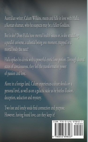 Australian visual artist, Calum Wilkins, travels to Korea. Feeling trapped in his solitude, he longs for a connection, a bond that will anchor him to the present, sweeping away the shadows of his past. Immersed in a foreign culture, he is looking for something more than love. He is looking for someone to complete him. He meets and falls in love with Halla, a Korean shaman. Halla and Calum's connection is not an ordinary romance by any means. For Halla, their romance brings mental conflict. This is her first love affair after many years of abstinence. Although having made a determined choice not to complicate her life by being in a relationship, this sudden connection has a resonance that runs deep. However, the rebellion of Halla's physical desires is destroying the fortress of self-reliance leaving her disoriented, a reality that contradicts the principles she clings to so fiercely. Calum, with his magnetic presence and allure, is becoming the instrument shattering her resolvAn unknown force, a magnetic attraction, that is a mystery to her, pulls her toward him. A riddle unfolds, an uncanny parallel universe, becomes increasingly evident to her as it builds in intensity. Halla collects seeds from the Gingko tree which she uses to make a powerful erotic love potion. The effect on Calum is gradual. As the chemical merges and becomes activated, it sends him into altered states of perception. The experience provokes a profound and confronting question. Is Halla much more than a Sharman? Could she really be the fallen Korean goddess, Jacheongbi? Is she crafting the persona of being a mortal? Vulnerable and disoriented, evidence accumulates in Calum's mind of the truth of her identity as he struggles with reality,an elusive paradigm, pirouetting on a precipice of deception. The lines between authenticity and artifice, become indistinct on his horizon of comprehension. Halla has been forced to live a clandestine lifestyle as there are those who seek her out. They are coming closer. With Calum beside her, she can see her life being lived how it should be lived, free of the prison walls around her.