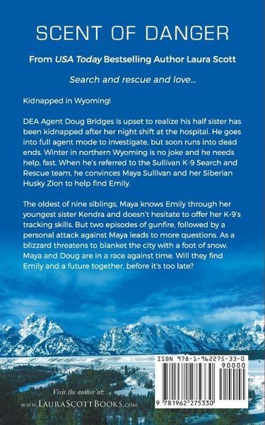 From USA Today Bestselling Author Laura Scott Search and rescue and love... Kidnapped in Wyoming! DEA Agent Doug Bridges is angry to realize his stepsister has been kidnapped after her night shift at the hospital. He goes into full agent mode to investigate, but soon runs into dead ends. Winter in northern Wyoming is no joke and he needs help, fast. When he's referred to the Sullivan K-9 Search and Rescue team, he convinces Maya Sullivan and her Siberian Husky Zion to help him find Emily. The oldest of nine siblings, Maya knows Emily through her youngest sister Kendra and doesn't hesitate to offer her K-9's tracking skills. But two episodes of gunfire, followed by a personal attack against Maya leads to more questions. Was the attack against Maya connected to Emily's kidnapping? As a blizzard threatens to blanket the city with a foot of snow, Maya and Doug are in a race against time. Will they find Emily and a chance at love before it's too late?
