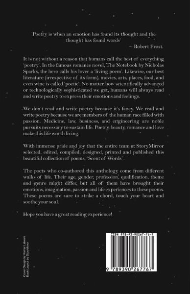 About the Book: 'Poetry is when an emotion has found its thought and the thought has found words' ~ Robert Frost. It is not without a reason that humans call the best of everything 'poetry'. In the famous romance novel, The Notebook by Nicholas Sparks, the hero calls his lover a 'living poem'. Likewise, our best literature (irrespective of its form), movies, arts, places, food, and even wine is called 'poetic'. No matter how scientifically advanced or technologically sophisticated we get, humans will always read and write poetry to express their emotions and feelings. We don't read and write poetry because it's fancy. We read and write poetry because we are members of the human race filled with passion. Medicine, law, business, and engineering are noble pursuits necessary to sustain life. Poetry, beauty, romance and love make this life worth living. With immense pride and joy that the entire team at StoryMirror selected, edited, compiled, designed, printed and published this beautiful collection of poems, "Scent of Words". The poets who co-authored this anthology come from different walks of life. Their age, gender, profession, qualification, theme and genre might differ, but all of them have brought their emotions, imagination, passion and life experiences to these poems. These poems are sure to strike a chord, touch your heart and soothe your soul. Hope you have a great reading experience!