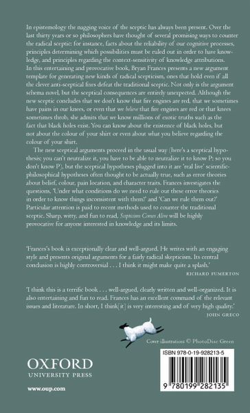In epistemology the nagging voice of the sceptic has always been present, whispering that 'You can't know that you have hands, or just about anything else, because for all you know your whole life is a dream.' Philosophers have recently devised ingenious ways to argue against and silence this voice, but Bryan Frances now presents a highly original argument template for generating new kinds of radical scepticism, ones that hold even if all the clever anti-sceptical fixes defeat the traditional sceptic. Sharp, witty, and fun to read, Scepticism Comes Alive will be highly provocative for anyone interested in knowledge and its limits.