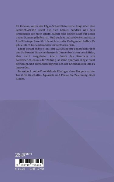 Pit Ferman, Autor der Edgar-Schaaf-Krimireihe, klagt über eine Schreibblockade. Nicht aus sich heraus, sondern weil sein Protagonist seit über einem halben Jahr keinen Stoff für einen neuen Roman geliefert hat. Und auch Kriminaloberkommissarin Rita Böhringer kann ihm da nicht aus der Verlegenheit helfen. Es gibt einfach keine literarisch verwertbaren Fälle. Edgar Schaaf selbst ist mit der Ausübung der Bauaufsicht über den Umbau des Türmchenhauses in Gengenbach zwar beschäftigt, aber nicht ausgelastet. Allein durch das Sammeln von Polizeiberichten aus der Zeitung ist seine Spürnase längst nicht befriedigt, und allmählich beginnt sich der Kriminalist in ihm zu langweilen. Da entdeckt seine Frau Melanie Köninger eines Morgens an der Tür ihres Geschäftes Aquarelle und Poesie die Zeichnung eines Kindes.