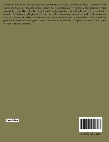 In dem Salon der in der Behrenstraße wohnenden Frau von Carayon und ihrer Tochter Victoire waren an ihrem gewöhnlichen Empfangsabend einige Freunde versammelt, aber freilich wenige nur, da die große Hitze des Tages auch die treuesten Anhänger des Zirkels ins Freie gelockt hatte. Von den Offizieren des Regiments Gensdarmes, die selten an einem dieser Abende fehlten, war nur einer erschienen, ein Herr von Alvensleben, und hatte neben der schönen Frau vom Hause Platz genommen unter gleichzeitigem scherzhaftem Bedauern darüber, daß gerade der fehle, dem dieser Platz in Wahrheit gebühre.
