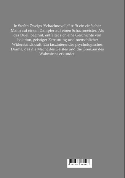 In Stefan Zweigs "Schachnovelle" trifft ein einfacher Mann auf einem Dampfer auf einen Schachmeister. Als das Duell beginnt, entfaltet sich eine Geschichte von Isolation, geistiger Zerrüttung und menschlicher Widerstandskraft. Ein faszinierendes psychologisches Drama, das die Macht des Geistes und die Grenzen des Wahnsinns erkundet.