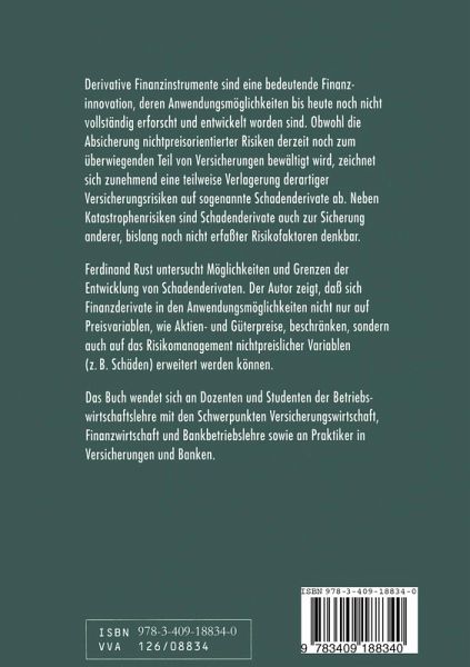 Ferdinand Rust untersucht Möglichkeiten und Grenzen der Entwicklung von Schadenderivaten. Der Autor zeigt, daß sich Finanzderivate in den Anwendungsmöglichkeiten nicht nur auf Preisvariablen wie Aktien- und Güterpreise beschränken, sondern auch auf das Risikomanagement nichtpreislicher Variablen, z.B. Schäden, erweitert werden können.
