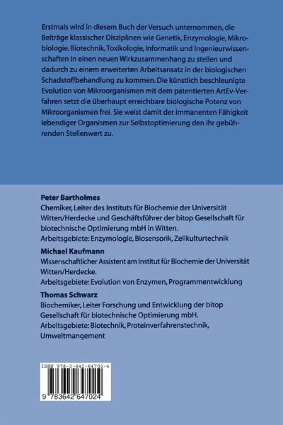 Erstmals wird in diesem Buch der Versuch unternommen, die Beiträge klassischer Disziplinen wie Genetik, Enzymologie, Mikrobiologie, Biotechnik, Toxikologie, Informatik und Ingenieurwissenschaften in einen neuen Wirkzusammenhang zu stellen und dadurch zu einem erweiterten Arbeitsansatz in der biologischen Schadstoffbehandlung zu kommen. Die künstlich beschleunigte Evolution von Mikroorganismen mit dem patentierten ArtEv-Verfahren setzt die überhaupt erreichbare biologische Potenz von Mikroorganismen frei. Sie weist damit der immanenten Fähigkeit lebendiger Organismen zur Selbstoptimierung den ihr gebührenden Stellenwert zu.