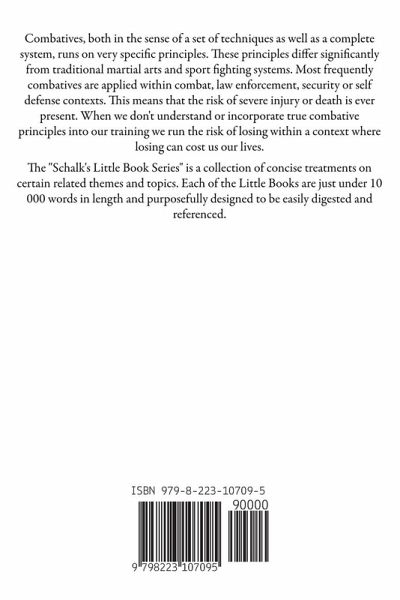 Combatives, both in the sense of a set of techniques as well as a complete system, runs on very specific principles. These principles differ significantly from traditional martial arts and sport fighting systems. Most frequently combatives are applied within combat, law enforcement, security or self defense contexts. This means that the risk of severe injury or death is ever present. When we don't understand or incorporate true combative principles into our training we run the risk of losing within a context where losing can cost us our lives. In this Little Book:The 3 main contextual considerations when it comes to combatives training and development. The importance of understanding your context and the factors that are influenced by context. Introduction to the Combative Triad. The core principles for successfully managing close combat incidents. Considerations on what needs to be included in training to successfully incorporate these principles. "Each time I read a new title by Schalk, I get happy, because good, useful information is about to get in the hands of people that need it. These "Little Books" are extremely valuable, and written in a very concise yet readable style. The newest one in your hands now, gives a very good overview of the training principles that really are universal, and important to successfully navigating the real world use of Combatives. There is no fluff between these covers, no padding of the lessons, just like Combatives, they are short, to the point, and if understood and trained, give you great bang for your buck. There is also plenty of room in this short book to work and wrestle with the lessons, to really make them yours, and apply them. I can't recommend this enough. Good, usable, concise, well presented, and accurate. This is a book you will keep going back to, as your eyes open, and your understanding grows." - Terry Trahan The "Schalk's Little Book Series" is a collection of concise treatments on certain related themes and topics. Each of the Little Books are just under 10 000 words in length and purposefully designed to be easily digested and referenced.