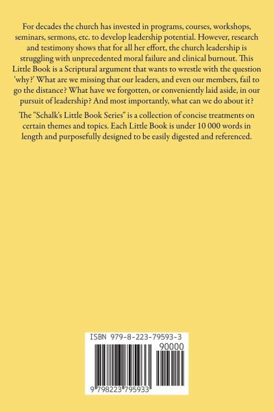 For decades the church has invested in programs, courses, workshops, seminars, sermons, etc. to develop leadership potential. However, research and testimony shows that for all her effort, the church leadership is struggling with unprecedented moral failure and clinical burnout. This Little Book is a Scriptural argument that wants to wrestle with the question 'why?' What are we missing that our leaders, and even our members, fail to go the distance? What have we forgotten, or conveniently laid aside, in our pursuit of leadership? And most importantly, what can we do about it? The "Schalk's Little Book Series" is a collection of concise treatments on certain themes and topics. Each Little Book is under 10 000 words in length and purposefully designed to be easily digested and referenced.