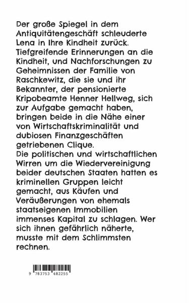 Der große Spiegel in dem Antiquitätengeschäft schleuderte Lena in Ihre Kindheit zurück. Tiefgreifende Erinnerungen an die Kindheit, und Nachforschungen zu Geheimnissen der Familie von Raschkewitz, die sie und ihr Bekannter, der pensionierte Kripobeamte Henner Hellweg, sich zur Aufgabe gemacht haben, bringen beide in die Nähe einer von Wirtschaftskriminalität und dubiosen Finanzgeschäften getriebenen Clique. Die politischen und wirtschaftlichen Wirren um die Wiedervereinigung beider deutschen Staaten hatten es kriminellen Gruppen leicht gemacht, aus Käufen und Veräußerungen von ehemals staatseigenen Immobilien immenses Kapital zu schlagen. Wer sich ihnen gefährlich näherte, musste mit dem Schlimmsten rechnen.