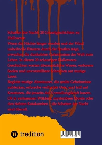 Schatten der Nacht: 20 Gruselgeschichten zu HalloweenWenn die Nächte länger werden und der Wind unheilvolle Flüstern durch die Straßen trägt, erwachen die dunkelsten Geheimnisse der Welt zum Leben. In diesen 20 schaurigen Halloween-Geschichten warten übernatürliche Wesen, verlorene Seelen und unvorstellbare Schrecken auf mutige Leser.Begleite mutige Abenteurer, die uralte Geheimnisse aufdecken, erforsche verfluchte Orte, und triff auf Kreaturen, die jenseits der Vorstellungskraft lauern. Ob in verlassenen Wäldern, mysteriösen Motels oder den tiefsten Katakomben - die Schatten der Nacht sind überall.Wirst du dich trauen, die Dunkelheit zu betreten?