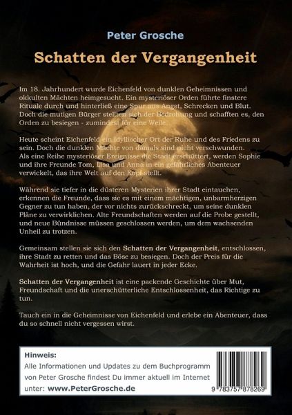 Schatten der VergangenheitIm 18. Jahrhundert wurde Eichenfeld von dunklen Geheimnissen und okkulten Mächten heimgesucht. Ein mysteriöser Orden führte finstere Rituale durch und hinterließ eine Spur aus Angst, Schrecken und Blut. Doch die mutigen Bürger stellten sich der Bedrohung und schafften es, den Orden zu besiegen - zumindest für eine Weile.Heute scheint Eichenfeld ein idyllischer Ort der Ruhe und des Friedens zu sein. Doch die dunklen Mächte von damals sind nicht verschwunden. Als eine Reihe mysteriöser Ereignisse die Stadt erschüttert, werden Sophie und ihre Freunde Tom, Lisa und Anna in ein gefährliches Abenteuer verwickelt, das ihre Welt auf den Kopf stellt.Während sie tiefer in die düsteren Mysterien ihrer Stadt eintauchen, erkennen die Freunde, dass sie es mit einem mächtigen und unbarmherzigen Gegner zu tun haben, der vor nichts zurückschreckt, um seine dunklen Pläne zu verwirklichen. Alte Freundschaften werden auf die Probe gestellt, und neue Bündnisse müssen geschlossen werden, um dem wachsenden Unheil zu trotzen.Gemeinsam stellen sie sich den Schatten der Vergangenheit, entschlossen, ihre Stadt zu retten und das Böse zu besiegen. Doch der Preis für die Wahrheit ist hoch, und die Gefahr lauert in jeder Ecke.Schatten der Vergangenheit ist eine packende Geschichte über Mut, Freundschaft und die unerschütterliche Entschlossenheit, das Richtige zu tun. Ein fesselnder Kriminalroman, der dich von der ersten bis zur letzten Seite in seinen Bann ziehen wird. Tauch ein in die Geheimnisse von Eichenfeld und erlebe ein Abenteuer, dass du so schnell nicht vergessen wirst.Mehr Buchinformationen unter:www.PeterGrosche.de