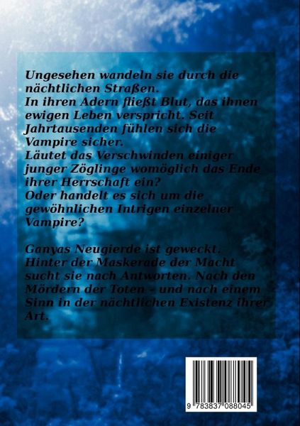 Ungesehen wandeln sie durch die nächtlichen Straßen. In ihren Adern fließt Blut, das ihnen ewigen Leben verspricht. Seit Jahrtausenden fühlen sich die Vampire sicher. Läutet das Verschwinden einiger junger Zöglinge womöglich das Ende ihrer Herrschaft ein? Oder handelt es sich um die gewöhnlichen Intrigen einzelner Vampire?Ganyas Neugierde ist geweckt. Hinter der Maskerade der Macht sucht sie nach Antworten. Nach den Mördern der Toten - und nach einem Sinn in der nächtlichen Existenz ihrer Art.