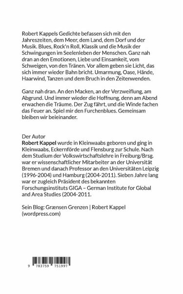 Schatten im Licht.GedichteRobert Kappels Gedichte befassen sich mit den Jahreszeiten, dem Meer, dem Land, dem Dorf und der Musik. Blues, Rock'n Roll, Klassik und die Musik der Schwingungen im Seelenleben der Menschen. Ganz nah dran an den Emotionen, Liebe und Einsamkeit, vom Schweigen, von den Tränen. Vor allem geben sie Licht, das sich immer wieder Bahn bricht. Umarmung, Oase, Hände, Haarwind, Tanzen und dem Bruch in den Zeitenwenden. Ganz nah dran. An den Macken, an der Verzweiflung, am Abgrund. Und immer wieder die Hoffnung, denn am Abend erwachen die Träume. Der Zug fährt, und die Winde fachen das Feuer an. Spiel mir den Furchenblues. Gemeinsam bleiben wir beieinander.