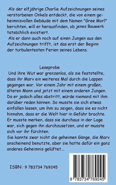 Als der elfjährige Charlie Aufzeichnungen seines verstorbenen Onkels entdeckt, die von einem geheimnisvollen Gebäude mit dem Namen "Gree Morl" berichten, will er herausfinden, ob jenes Gebäude tatsächlich existiert. Als er dann auch noch auf einen Jungen aus den Aufzeichnungen trifft, ist das erst der Beginn der turbulentesten Ferien seines Lebens.Leseprobe: Und ihre Wut war grenzenlos, als sie feststellte, dass ihr Marv ein weiteres Mal durch die Lappen gegangen war. Vor einem Jahr mit einem großen, älteren Mann und jetzt mit einem anderen Jungen. Da er jedoch alles abstritt, würde niemand mit ihm darüber reden können. So musste sie sich etwas einfallen lassen, um ihm zu zeigen, dass sie es nicht hinnahm, dass er die Welt hier in Gefahr brachte. Er musste merken, dass sie durchaus in der Lage war, sich gegen ihn durchzusetzen, und er musste sich vor ihr fürchten.Sie kannte zwar nicht die geheimen Gänge, die Marv anscheinend benutzte, aber sie hatte dafür ein ganz anderes Geheimnis gelüftet...