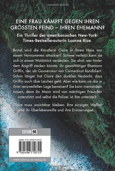 Brutal wird die Künstlerin Claire in ihrem Haus von einem Vermummten attackiert. Schwer verletzt kann sie sich in einem Waldstück verstecken. Sie ahnt, wer hinter dem Angriff stecken könnte: ihr gewalttätiger Ehemann Griffin, der als Gouverneur von Connecticut kandidiert. Schon länger hat Claire den dunklen Verdacht, dass Griffin auch über Leichen geht. Aber wie kann sie das in ihrer verzweifelten Lage beweisen? Sie kann niemandem trauen, denn ihr Mann wird von mächtigen Freunden unterstützt und selbst die Polizei ist ihm unterstellt.