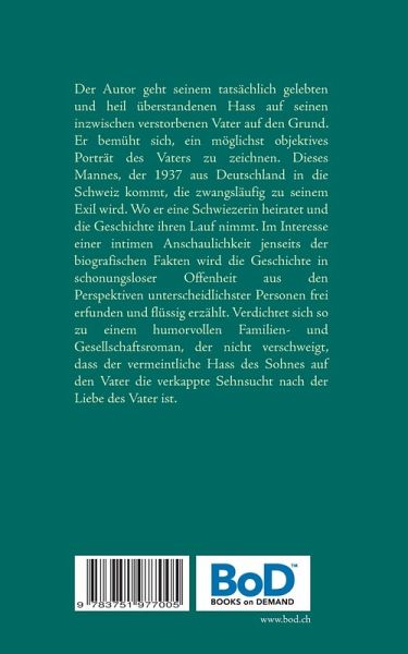 Der Autor geht seinem tatsächlich gelebten und heil überstandenen Hass auf seinen inzwischen verstorbenen Vater auf den Grund. Er bemüht sich, ein möglichst objektives Porträt seines Vaters zu zeichnen. Dieses Mannes, der 1937 aus Deutschland in die Schweiz kommt, die zu seinem Exil wird. Wo er eine Schweizerin heiratet und die Geschichte ihren Lauf nimmt. Im Interesse einer intimen Anschaulichkeit jenseits der biografischen Fakten wird die Geschichte in schonungsloser Offenheit aus den unterschiedlichsten Perspektiven frei erfunden und flüssig erzählt und verdichtet sich zu einem humorvollen Familien- und Gesellschaftsroman, der nicht verschweigt, dass der vermeintliche Hass des Sohnes auf den Vater die verkappte Sehnsucht nach der Liebe des Vaters ist.