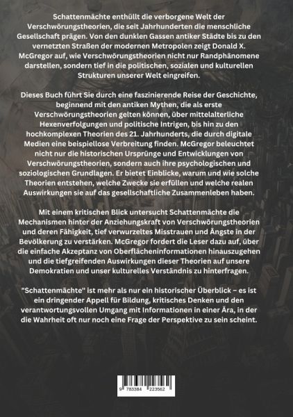 Schattenmächte enthüllt die verborgene Welt der Verschwörungstheorien, die seit Jahrhunderten die menschliche Gesellschaft prägen. Von den dunklen Gassen antiker Städte bis zu den vernetzten Straßen der modernen Metropolen zeigt Donald X. McGregor auf, wie Verschwörungstheorien nicht nur Randphänomene darstellen, sondern tief in die politischen, sozialen und kulturellen Strukturen unserer Welt eingreifen.Dieses Buch führt Sie durch eine faszinierende Reise der Geschichte, beginnend mit den antiken Mythen, die als erste Verschwörungstheorien gelten können, über mittelalterliche Hexenverfolgungen und politische Intrigen, bis hin zu den hochkomplexen Theorien des 21. Jahrhunderts, die durch digitale Medien eine beispiellose Verbreitung finden. McGregor beleuchtet nicht nur die historischen Ursprünge und Entwicklungen von Verschwörungstheorien, sondern auch ihre psychologischen und soziologischen Grundlagen. Er bietet Einblicke, warum und wie solche Theorien entstehen, welche Zwecke sie erfüllen und welche realen Auswirkungen sie auf das gesellschaftliche Zusammenleben haben.Mit einem kritischen Blick untersucht Schattenmächte die Mechanismen hinter der Anziehungskraft von Verschwörungstheorien und deren Fähigkeit, tief verwurzeltes Misstrauen und Ängste in der Bevölkerung zu verstärken. McGregor fordert die Leser dazu auf, über die einfache Akzeptanz von Oberflächeninformationen hinauszugehen und die tiefgreifenden Auswirkungen dieser Theorien auf unsere Demokratien und unser kulturelles Verständnis zu hinterfragen."Schattenmächte" ist mehr als nur ein historischer Überblick - es ist ein dringender Appell für Bildung, kritisches Denken und den verantwortungsvollen Umgang mit Informationen in einer Ära, in der die Wahrheit oft nur noch eine Frage der Perspektive zu sein scheint.
