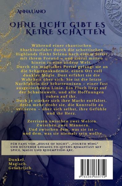 "Ein Schattenelf, der verführt und zerstört. Eine uralte Bestimmung, die Selena in die Dunkelheit zieht. Und ihr Herz, das unwiderruflich dem Licht gehört."Gefährliche Magie, eine Elite und bösartige Intrigen - Selena, die letzte Schattennixe, muss sich entscheiden: Wird sie zum Werkzeug der Dunkelheit oder findet sie ihren eigenen Weg? Doch die größte Gefahr lauert nicht im Schatten, sondern in ihr selbst. Und in Carter, dem kaltherzigen Schattenelf, der sie verführen soll.»Die Schatten wurden größer und dichter, ihre kalten Arme griffen nach mir. Mit aller Kraft dachte ich an sein Gesicht und wünschte mir, er wäre hier, um die Dunkelheit in mir zu vertreiben.«- Zerrissen zwischen zwei Welten.- Zwischen zwei Männern.- Und zwischen dem, was sie ist - und dem, was sie niemals sein wollte.Band 1 der Shadow-Beyond-Reihe von Anna UanoEin Hardcover zum Verlieben: Für Fans von "House of Night", "Fourth Wing" und düsterer Enemies-to-Lovers-Romantasy mit Spice, Magie und Redemption-Arc. Das sagen Leser: Schattennixe ist kein gewöhnlicher Fantasyroman. Es ist eine Geschichte über das Finden des eigenen Lichts - mitten im Dunkel.Mit starken Charakteren, einem atmosphärischen Setting und einer prickelnden Dreieckbeziehung gelingt Anna Uano ein emotionaler, magischer Auftakt, der berührt und nachhallt. (Anne-Kathrin)Ich konnte nicht aufhören zu lesen - ich musste wissen, wie es weitergeht!Diese Geschichte hat mich vollkommen in ihren Bann gezogen: magisch, düster, fesselnd und gleichzeitig voller Emotionen. (Michaela)