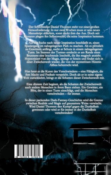 Der Schriftsteller Daniel Thorsten steht vor einer großen Herausforderung: In nur zwei Wochen muss er sein neues Manuskript abliefern, sonst droht ihm das Aus. Doch seit Monaten plagen ihn Selbstzweifel, die seine Inspiration hemmen.Aut der Suche nach neuer Inspiration beschließt er, einen Spaziergang im nahegelegenen Park zu machen. Als es plötzlich zu Gewittern anfängt, sucht er Schutz in einem nahegelegenen Turm. Im Inneren des Turmes entdeckt er am Rande eines Brunnens eine leuchtende Inschrift, die ihn magisch anzieht.Hypnotisiert von der Magie, springt er hinein und findet sich in einer Zwischenwelt wieder, die von der mysteriösen Hüterin Althea beherrscht wird.Hier lernt er die Kunst des Verschwindens - eine Fähigkeit, die ihm Macht und Freiheit verspricht. Doch als er in seine eigene Welt zurückkehrt, bringt er die Schatten dieser Zwischenwelt mit.Eine düstere Zeit beginnt, als die Schatten der Zwischenwelt auch andere Menschen in ihren Bann ziehen. Ein Gewitter, ein Blitz, der in einen Turm einschlägt, und die Menschen verschwinden - für immer.In dieser packenden Dark-Fantasy-Geschichte wird die Grenze zwischen Realität und Magie auf grausamste Weise verwischt. Wird Daniel Thorsten den Kampf gegen die Dunkelheit gewinnen oder wird er für immer in der Dunkelheit verschwinden?