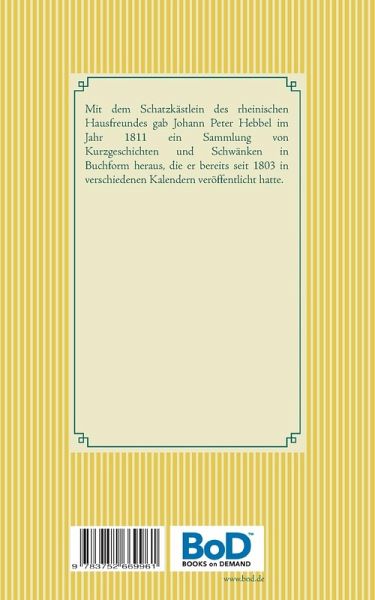 Mit dem Schatzkästlein des rheinischen Hausfreundes gab Johann Peter Hebbel im Jahr 1811 ein Sammlung von Kurzgeschichten und Schwänken in Buchform heraus, die er bereits seit 1803 in verschiedenen Kalendern veröffentlicht hatte.
