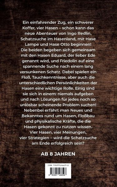 Ein einfahrender Zug, ein schwerer Koffer, vier Hasen - schon kann das neue Abenteuer von Ingo Redlin, Schatzsuche im Hasenland, mit Hase Lampe und Hase Otto beginnen!Die beiden begeben sich gemeinsam mit den Hasen Eduard, der lieber Ede genannt wird, und Friedolin auf eine spannende Suche nach einem lang versunkenen Schatz. Dabei spielen ein Floß, Tauchkenntnisse, aber auch die unterschiedlichen Persönlichkeiten der Hasen eine wichtige Rolle. Einig sind sie sich in einem: niemals aufgeben und nach Lösungen für jedes noch so unlösbar scheinende Problem suchen! Nebenbei erfährt man Neues und Bekanntes rund um Hasen, Floßbau und physikalische Kräfte, die die Hasen gekonnt zu nutzen wissen. Vier Hasen, vier Meinungen, vier Strategien - wird die Schatzsuche am Ende erfolgreich sein?