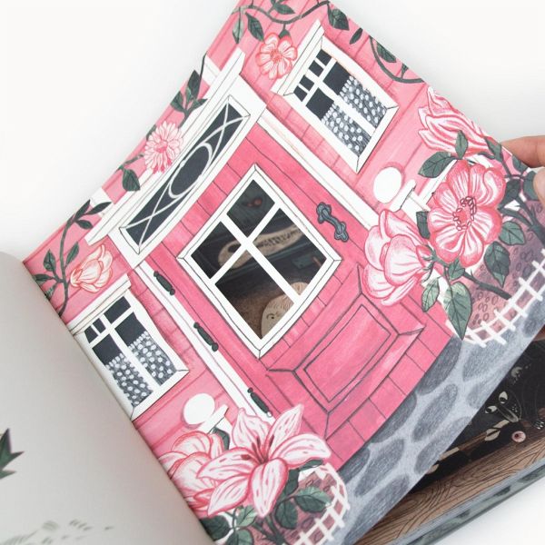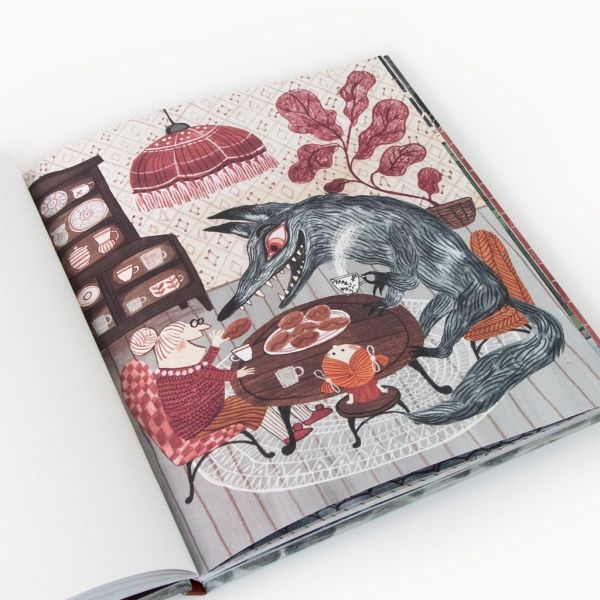 Durch ein Fenster sieht man im Haus den Wolf sitzen, aus seinem geöffneten Mund blitzen spitze Zähne und er leckt sich schon die Lippen, während er gierig auf sein Opfer hinunterschaut, das er gleich verspeisen wird. Schon das Titelbild von "Schau durchs Fenster" ist eindrucksvoll und ausdrucksstark gestaltet und wirkt durch das gestanzte Fenster beinahe plastisch. Die Szene im Fenster wirkt mehr als bedrohlich und ganz selbstverständlich reimen wir uns durch den Ausschnitt zusammen, dass gleich etwas Schlimmes passieren wird. Und genau mit diesen Erwartungen spielt die Autorin Katerina Gorelik in diesem Bilderbuch, das uns sofort magisch angezogen hat.