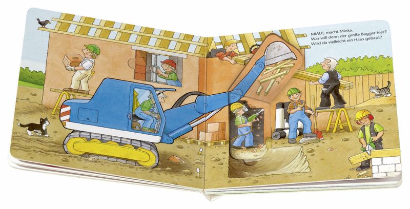 Bagger, Betonmischer, Müllauto und Gabelstapler ... Hinter vielen großen Klappen können kleine Kinder die spannende Welt der Fahrzeuge entdecken. Und Minka, die kleine Katze, begleitet sie dabei.
