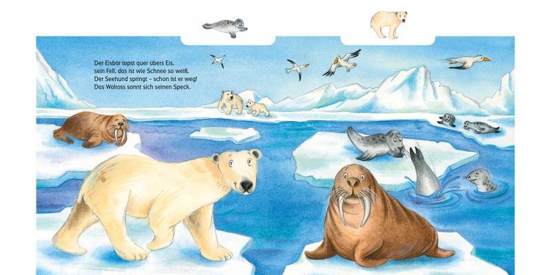 Das große Walross sonnt sich. Die wilden Wölfe toben. Und was machen die Delfine? Das und noch viel mehr erfahren kleine Tierfans ab 18 Monaten in diesem farbenfrohen Buch.