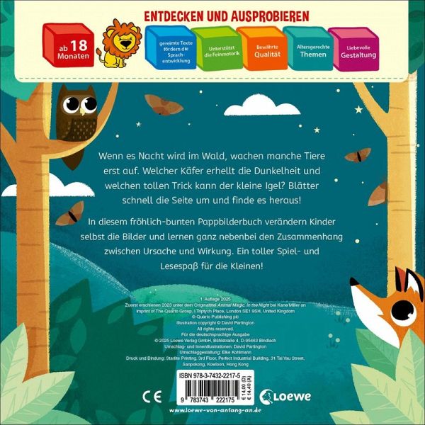 Pappbilderbuch ab 18 Monaten Mit tollen Spielelementen: faszinierende Verwandelbilder zum Spielen und Staunen Tolle Wow-Effekte beim Umblättern durch Schiebeelemente Kinder sind aktiv Teil der Geschichte, was die Freude am Vorlesen stärkt Interaktiver Spieleffekt: Die Kinder verändern die Szenen selbst Fördert die Feinmotorik Gereimte Texte trainieren die Sprachfähigkeitund erweitern den Wortschatz Ideal zum gemeinsamen Vorlesen oder Alleinbeschäftigung Praktisches und robustes Format auch für unterwegs Sicherheit und Qualität: stabile Seiten mit abgerundeten Ecken Verbindet Unterhaltung und Wissensvermittlung: Kinder lernen ganz nebenbei spannende nachtaktive Tiere Für alle kleinen und großen Tierfans