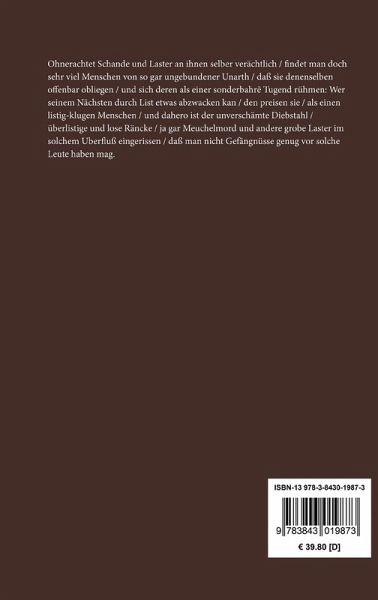 Anonym: Schau-Platz der Betrieger. Entworffen in vielen List- und Lustigen Welt-Händeln Ohnerachtet Schande und Laster an ihnen selber verächtlich / findet man doch sehr viel Menschen von so gar ungebundener Unarth / daß sie denenselben offenbar obliegen / und sich deren als einer sonderbahr¿ Tugend rühmen: Wer seinem Nächsten durch List etwas abzwacken kan / den preisen sie / als einen listig-klugen Menschen / und dahero ist der unverschämte Diebstahl / überlistige und lose Räncke / ja gar Meuchelmord und andere grobe Laster im solchem Uberfluß eingerissen / daß man nicht Gefängnüsse genug vor solche Leute haben mag. Erstdruck: Schau-Platz der Betrieger: Entworffen in vielen List- und Lustigen Welt-Händeln [...]. Hamburg, Frankfurt am Main, 1687. Vollständige Neuausgabe. Herausgegeben von Karl-Maria Guth. Berlin 2013. Textgrundlage ist die Ausgabe: Schau-Platz der Betrieger: Entworffen in vielen List- und Lustigen Welt-Händeln [...]. Hamburg, Frankfurt am Main, 1687. Die Paginierung obiger Ausgabe wird in dieser Neuausgabe als Marginalie zeilengenau mitgeführt. Umschlaggestaltung von Thomas Schultz-Overhage unter Verwendung des Bildes: Annibale Carracci, Remo tötet die Diebe und schlägt die Horde in die Flucht, 1590. Gesetzt aus Minion Pro, 11 pt.