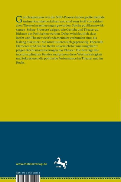 Vorwort.- Schau-Prozesse. Gericht und Theater als Bühnen des Politischen.- 438 Tage. Der NSU-Prozess am Münchner Oberlandesgericht.- Die Politik der Bühne.- Der Gerichtssaal als Bühne?.- "In der Öffentlichkeit, aber nicht für die Öffentlichkeit" - die Frage nach dem angemessenen Maß an Gerichtsöffentlichkeit.- Gerichtsöffentlichkeit im Scheinwerferlicht.- Die Schauseite des Auschwitzprozesses und ihre juristische, literarische und rechtspolitische Bedeutung.- Was hat das (noch) mit uns zu tun? Die (Un-)Möglichkeit von Orestie-Inszenierungen im 21. Jahrhundert? Zwei Beispiele.- Tragödie als Medium für die Rechtskritik. Neue Formen für die Recht und Literatur-Bewegung.- "Nur Sie sind dazu berufen, hier zu urteilen." Schau-Prozesse im deutschen Gegenwartstheater und ihr politisches Potenzial.- Rechtsakte - Anmerkungen zum puovoir prostituant.