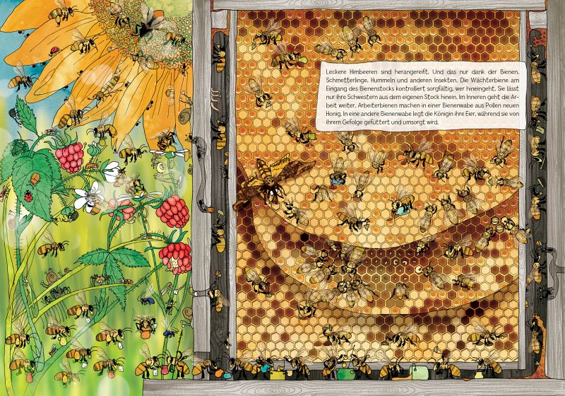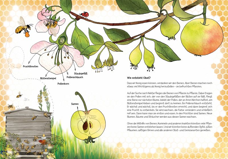 Der Frühling ist da! Die ersten Blumen und Bäume blühen und dazwischen hört man es munter summen und brummen. Die Bienen haben ihren Stock verlassen und sammeln eifrig Pollen und Nektar. Aber hast du dich schon einmal gefragt, warum sie das machen? Und woher kommt eigentlich der Honig und wie entstehen die Früchte?
