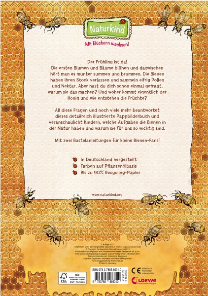 Nahwelt zum Mitmachen und Erleben in der Naturkind-Reihe! Mit wimmeligen Bildern, Bastelanleitungen und Informationsseiten zeigt dieses großformatige Pappbilderbuch Kindern das faszinierende Leben der Bienen sowie deren enorme Wichtigkeit für unsere Umwelt und wie diese im Laufe eines Jahres leben.