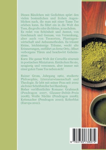 Dieses Bändchen mit Gedichten spürt den vielen besinnlichen und frohen Augenblicken nach, die man mit einer Tasse Tee erleben kann. Es führt ein in die Welt des Tees, die große oder die kleine, je nachdem.Es redet von Schönheit und Anmut, von Geschmack und Genuss, von Versenkung, aber auch von Teesorten und Anbaumethoden. Es träumt kleine, leichtsinnige Träume, weckt alte Erinnerungen, entführt an ferne Orte, öffnet verborgene Türen und beschwört Geheimnisse.Kurz: Die ganze Welt der Camelia sinensis in poetischen Miniaturen. Entdecken Sie sie, neugierig und versonnen, aber immer mit einer guten Tasse Tee neben sich!