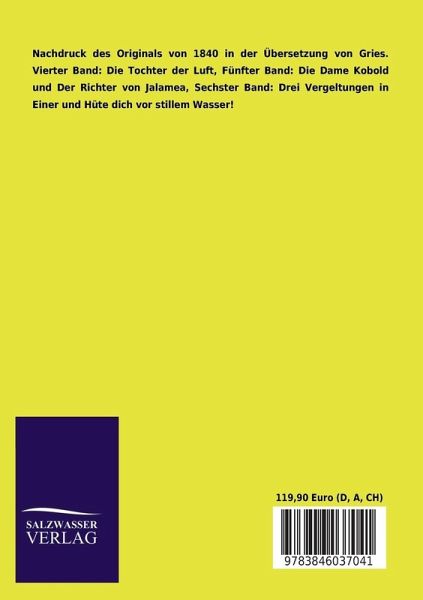 Nachdruck des Originals von 1840 in der Übersetzung von Gries. Vierter Band: Die Tochter der Luft, Fünfter Band: Die Dame Kobold und Der Richter von Jalamea, Sechster Band: Drei Vergeltungen in Einer und Hüte dich vor stillem Wasser!
