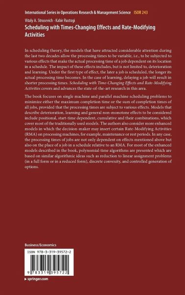 The book focuses on single machine and parallel machine scheduling problems to minimize either the maximum completion time or the sum of completion times of all jobs, provided that the processing times are subject to various effects. Models that describe deterioration, learning and general non-monotone effects to be considered include positional, start-time dependent, cumulative and their combinations, which cover most of the traditionally used models. The authors also consider more enhanced models in which the decision-maker may insert certain Rate-Modifying Activities (RMA) on processing machines, such as for example, maintenance or rest periods. In any case, the processing times of jobs are not only dependent on effects mentioned above but also on the place of a job in a schedule relative to an RMA. For most of the enhanced models described in the book, polynomial-time algorithms are presented which are based on similar algorithmic ideas such as reduction to linear assignment problems (in a full form or in a reduced form), discrete convexity, and controlled generation of options.