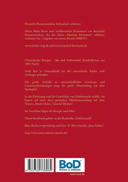 Deutsche Hausmannskost kulinarisch verfeinert.Dieses Buch bietet viele verführerische Kreationen von deutscher Hausmannskost, die der Autor "Manfred Herrmann" raffiniert verfeinert hat. Umgeben von einem Hauch ORIENT.www.weisser-ring.de und www.manfred-herrmann.de Orientalische Rezepte - das sind kulinarische Köstlichkeiten aus 1001 Nacht.Auch hier in Deutschland hat die orientalische Küche viele Anhänger gefunden.Die große Vielzahl an unterschiedlichen Gewürzen und Geschmacksrichtungen sorgt für große Abwechslung auf dem Speiseplan.In der Einleitung wird die Geschichte von Scheherazade erzählt. Sie basiert auf einer alten persischen Märchensammlung mit dem Namen "Hezâr Afsâna, Tausend Mythen".Im Anschluss folgen die Rezepte und Infos.Dieses Kochbuch gehört zu der Buchreihe "Scheherazade".Idee, Buchcovergestaltung und Satz: © 2014 Autorin "Jutta Schütz"http://www.jutta-schuetz-autorin.de