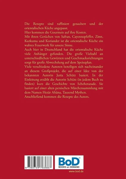 Die Rezepte sind raffiniert gezaubert und der orientalischen Küche angepasst.Hier kommen die Gourmets auf ihre Kosten.Mit ihren Gerüchen von Safran, Cayennepfeffer, Zimt, Kurkuma und Koriander ist die orientalische Küche ein wahres Feuerwerk für unsere Sinne. Auch hier in Deutschland hat die orientalische Küche viele Anhänger gefunden. Die große Vielzahl an unterschiedlichen Gewürzen und Geschmacksrichtungen sorgt für große Abwechslung auf dem Speiseplan. Viele verschiedene Autoren beteiligen sich nacheinander an diesem Großprojekt, die auf einer Idee von der bekannten Autorin Jutta Schütz basiert. In der Einleitung erzählt die Autorin Schütz (in jedem Buch zu finden) kurz die Geschichte von Scheherazade. Sie basiert auf einer alten persischen Märchensammlung mit dem Namen Hezâr Afsâna, Tausend Mythen. Anschließend kommen die Rezepte des Autors.