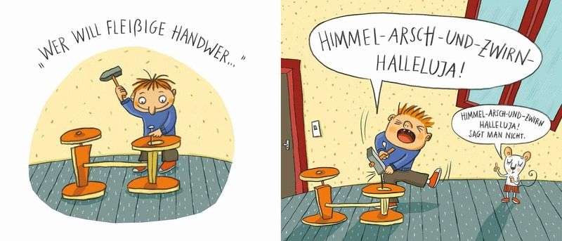 Im Buch geht es um Schimpfwörter. Eine kleine Maus passt in unterschiedlichen Situationen auf, wenn andere Personen Schimpfwörter nutzen,