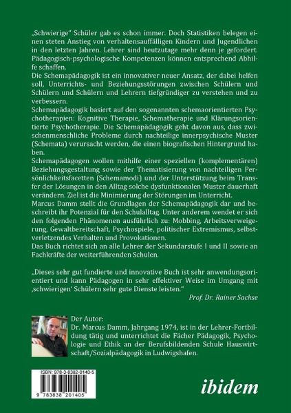 "Schwierige" Schüler gab es schon immer. Doch Statistiken belegen einen steten Anstieg von verhaltensauffälligen Kindern und Jugendlichen in den letzten Jahren. Lehrer sind heutzutage mehr denn je gefordert. Pädagogisch-psychologische Kompetenzen können entsprechend Abhilfe schaffen. Die Schemapädagogik ist ein innovativer neuer Ansatz, der dabei helfen soll, Unterrichts- und Beziehungsstörungen zwischen Schülern und Schülern und Schülern und Lehrern tiefgründiger zu verstehen und zu verbessern. Schemapädagogik basiert auf den sogenannten schemaorientierten Psychotherapien: Kognitive Therapie, Schematherapie und Klärungsorientierte Psychotherapie. Die Schemapädagogik geht davon aus, dass zwischenmenschliche Probleme durch nachteilige innerpsychische Muster (Schemata) verursacht werden, die einen biografischen Hintergrund haben. Schemapädagogen wollen mithilfe einer speziellen (komplementären) Beziehungsgestaltung sowie der Thematisierung von nachteiligen Persönlichkeitsfacetten (Schemamodi) und der Unterstützung beim Transfer der Lösungen in den Alltag solche dysfunktionalen Muster dauerhaft verändern. Ziel ist die Minimierung der Störungen im Unterricht. Marcus Damm stellt die Grundlagen der Schemapädagogik dar und beschreibt ihr Potenzial für den Schulalltag. Unter anderem wendet er sich den folgenden Phänomenen ausführlich zu: Mobbing, Arbeitsverweigerung, Gewaltbereitschaft, Psychospiele, politischer Extremismus, selbstverletzendes Verhalten und Provokationen. Das Buch richtet sich an alle Lehrer der Sekundarstufe I und II sowie an Fachkräfte der weiterführenden Schulen.