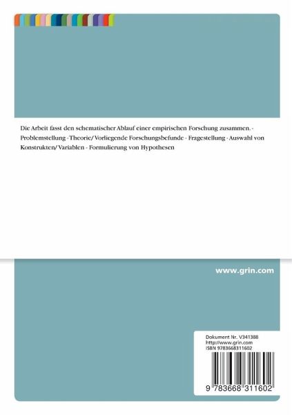 Zusammenfassung aus dem Jahr 2016 im Fachbereich Soziologie - Methodologie und Methoden, Ruhr-Universität Bochum (Fakultät für Sportwissenschaft), Veranstaltung: Methodenlehre, Sprache: Deutsch, Abstract: Die Arbeit fasst den schematischer Ablauf einer empirischen Forschung zusammen.- Problemstellung- Theorie/ Vorliegende Forschungsbefunde- Fragestellung- Auswahl von Konstrukten/ Variablen - Formulierung von Hypothesen