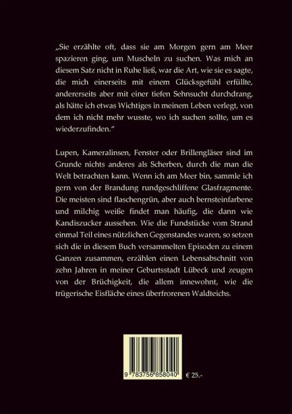 Lupen, Kameralinsen, Fenster oder Brillengläser sind im Grunde nichts anderes als Scherben, durch die man die Welt betrachten kann. Wenn ich am Meer bin, sammle ich gern von der Brandung rundgeschliffene Glasfragmente. Die meisten sind flaschengrün, aber auch bernsteinfarbene und milchig weiße findet man häufig, die dann wie Kandiszucker aussehen. Wie die Fundstücke vom Strand einmal Teil eines nützlichen Gegenstandes waren, so setzen sich die in diesem Buch versammelten Episoden, zu einem Ganzen zusammen, erzählen einen Lebensabschnitt von zehn Jahren in meiner Geburtsstadt Lübeck und zeugen von der Brüchigkeit, die allem innewohnt, wie die trügerische Eisfläche eines überfrorenen Waldteichs.Bei dem vorliegenden Buch handelt es sich um den zweiten Teil meiner Autobiografie. Der erste Teil ist als Paperback-Ausgabe im Mai 2022 bei BoD unter dem Titel "Und sonst?- Lübecker Kindheits- und Jugenderinnerungen" erschienen.