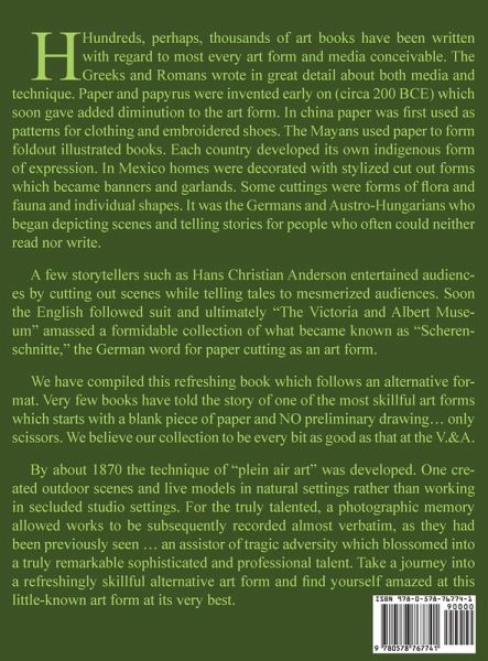Hundreds, perhaps, thousands of art books have been written with regard to most every art form and media conceivable. The Greeks and Romans wrote in great detail about both media and technique. Paper and papyrus were invented early on (circa 200 BCE) which soon gave added diminution to the art form. In china paper was first used as patterns for clothing and embroidered shoes. The Mayans used paper to form foldout illustrated books. Each country developed its own indigenous form of expression. In Mexico homes were decorated with stylized cut out forms which became banners and garlands. Some cuttings were forms of flora and fauna and individual shapes. It was the Germans and Austro-Hungarians who began depicting scenes and telling stories for people who often could neither read nor write. A few storytellers such as Hans Christian Anderson entertained audiences by cutting out scenes while telling tales to mesmerized audiences. Soon the English followed suit and ultimately "The Victoria and Albert Museum" amassed a formidable collection of what became known as "Scherenschnitte," the German word for paper cutting as an art form. We have compiled this refreshing book which follows an alternative format. Very few books have told the story of one of the most skillful art forms which starts with a blank piece of paper and NO preliminary drawing ... only scissors. We believe our collection to be every bit as good as that at the V.&A. By about 1870 the technique of "plein air art" was developed. One created outdoor scenes and live models in natural settings rather than working in secluded studio settings. For the truly talented, a photographic memory allowed works to be subsequently recorded almost verbatim, as they had been previously seen ... an assistor of tragic adversity which blossomed into a truly remarkable sophisticated and professional talent. Take a journey into a refreshingly skillful alternative art form and find yourself amazed at this little-known art form at its very best.