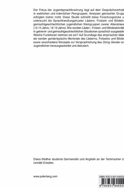 Der Fokus der Jugendsprachforschung liegt auf dem Gesprächsverhalten in weiblichen und männlichen Peergruppen, Analysen gemischter Gruppen erfolgten bisher nicht. Diese Studie schließt diese Forschungslücke und untersucht die Sprachhandlungsmuster Lästern, Frotzeln und Blödeln in gemischtgeschlechtlichen jugendlichen Kleingruppen zweier Altersklassen (12-15 Jahre, 16-19 Jahre). Wie werden Läster-, Frotzel- und Blödelaktivitäten in getrennt- und gemischtgeschlechtlichen Situationen sprachlich ausgestaltet? Welche Funktionen nehmen sie ein? Auf Grundlage des empirischen Materials werden gendertypische Merkmale des Lästerns, Frotzelns und Blödelns sowie verschiedene Konzepte zur Versprachlichung des Doing Gender unter Jugendlichen herausgearbeitet und diskutiert.