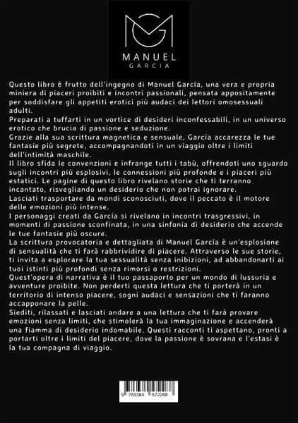 Questo libro nasce da un'idea di Manuel García, una vera e propria miniera di piaceri proibiti e incontri passionali, pensata appositamente per soddisfare gli appetiti erotici più audaci dei lettori adulti omosessuali.Preparatevi a tuffarvi in un vortice di desideri inconfessabili, in un universo erotico che brucia di passione e seduzione. Grazie alla sua scrittura magnetica e sensuale, García accarezza le vostre fantasie più segrete, accompagnandovi in un viaggio oltre i limiti dell'intimità maschile.Il libro sfida le convenzioni e infrange tutti i tabù, offrendo uno sguardo agli incontri più esplosivi, ai legami più profondi e ai piaceri più estatici. Le pagine di questo libro rivelano storie che vi terranno incantati, risvegliando un desiderio che non potrete ignorare.Lasciatevi trasportare da mondi sconosciuti, dove il peccato è il motore delle emozioni più intense. I personaggi creati da García si rivelano in incontri trasgressivi, in momenti di passione sconfinata, in una sinfonia di desiderio che accende le vostre fantasie più oscure.La scrittura provocatoria e dettagliata di Manuel García è un'esplosione di sensualità che vi farà rabbrividire di piacere. Attraverso le sue storie, vi invita a esplorare la vostra sessualità senza inibizioni, ad abbandonarvi ai vostri istinti più profondi senza rimorsi o restrizioni.Quest'opera di narrativa è il vostro passaporto per un mondo di lussuria e avventure proibite. Non perdetevi questa lettura che vi porterà in un territorio di piacere intenso, sogni audaci e sensazioni che vi faranno accapponare la pelle.Sedetevi, rilassatevi e lasciatevi andare a una lettura che vi farà provare emozioni senza limiti, che stimolerà la vostra immaginazione e accenderà una fiamma di desiderio indomabile. Questi racconti vi aspettano, pronti a portarvi oltre i limiti del piacere, dove la passione è sovrana e l'estasi è la vostra compagna di viaggio.