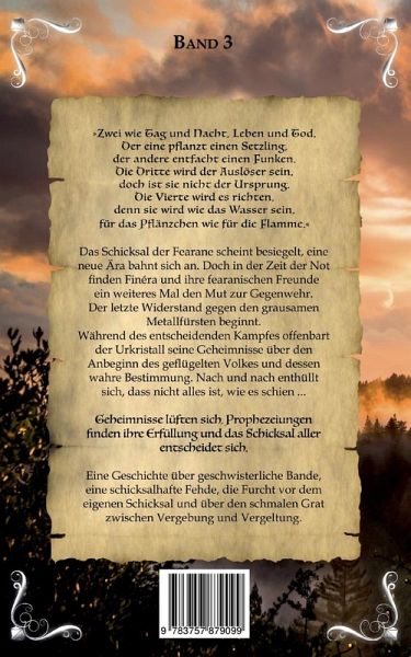 Band 3 der Fearane-Trilogie»Zwei wie Tag und Nacht, Leben und Tod. Der eine pflanzt einen Setzling, der andere entfacht einen Funken. Die Dritte wird der Auslöser sein, doch ist sie nicht der Ursprung. Die Vierte wird es richten, denn sie wird wie das Wasser sein, für das Pflänzchen wie für die Flamme.«Das Schicksal der Fearane scheint besiegelt, eine neue Ära bahnt sich an. Doch in der Zeit der Not finden Finéra und ihre fearanischen Freunde ein weiteres Mal den Mut zur Gegenwehr. Der letzte Widerstand gegen den grausamen Metallfürsten beginnt.Während des entscheidenden Kampfes offenbart der Urkristall seine Geheimnisse über den Anbeginn des geflügelten Volkes und dessen wahre Bestimmung. Nach und nach enthüllt sich, dass nicht alles ist, wie es schien ... Geheimnisse lüften sich, Prophezeiungen finden ihre Erfüllung und das Schicksal aller entscheidet sich.Eine Geschichte über geschwisterliche Bande, eine schicksalhafte Fehde, die Furcht vor dem eigenen Schicksal und über den schmalen Grat zwischen Vergebung und Vergeltung.