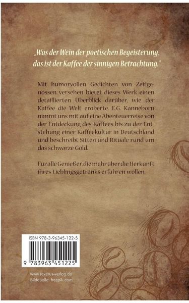 "Was der Wein der poetischen Begeisterung, das ist der Kaffee der sinnigen Betrachtung." Mit humorvollen Gedichten von Zeitgenossen versehen bietet dieses Werk einen detaillierten Überblick darüber, wie der Kaffee die Welt eroberte. E.G. Kanneborn nimmt uns mit auf eine Abenteuerreise von der Entdeckung des Kaffees bis zu der Entstehung einer Kaffeekultur in Deutschland und beschreibt Sitten und Rituale rund um das schwarze Gold.Für alle Genießer, die mehr über die Herkunft ihres Lieblingsgetränks erfahren wollen