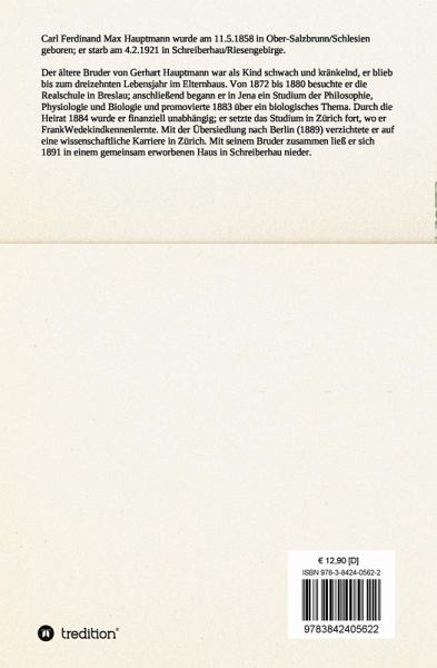Carl Ferdinand Max Hauptmann wurde am 11.5.1858 in Ober-Salzbrunn/Schlesien geboren; er starb am 4.2.1921 in Schreiberhau/Riesengebirge.Der ältere Bruder von Gerhart Hauptmann war als Kind schwach und kränkelnd, er blieb bis zum dreizehnten Lebensjahr im Elternhaus. Von 1872 bis 1880 besuchte er die Realschule in Breslau; anschließend begann er in Jena ein Studium der Philosophie, Physiologie und Biologie und promovierte 1883 über ein biologisches Thema. Durch die Heirat 1884 wurde er finanziell unabhängig; er setzte das Studium in Zürich fort, wo er FrankWedekindkennenlernte. Mit der Übersiedlung nach Berlin (1889) verzichtete er auf eine wissenschaftliche Karriere in Zürich. Mit seinem Bruder zusammen ließ er sich 1891 in einem gemeinsam erworbenen Haus in Schreiberhau nieder.