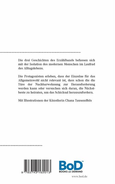 Die drei Geschichten des Erzählbands befassen sich mit der Isolation des modernen Menschen im Laufrad des Alltagslebens. Die Protagonisten erleben, dass der Einzelne für das Allgemeinwohl nicht relevant ist, dass schon die Türe der Nachbarwohnung zur Herausforderung werden kann oder versuchen sich daran, die Nächstbeste zu heiraten, um das Schicksal herauszufordern.Mit drei Illustrationen der Künstlerin Chana Tausendfels