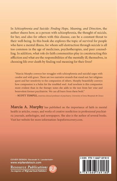 In Schizophrenia and Suicide: Finding Hope, Meaning, and Direction, the author shares how, as a person with schizophrenia, the thought of suicide, for her, and also for others with this disease, can be a constant threat to their well-being. In this book she explores the topic of survival for people who have a mental illness, for whom self-destruction through suicide is all too common in the age of medicines, psychotherapies, and peer counselling. In addition, what role do faith communities play in counteracting this affliction and what are the responsibilities of the mentally ill, themselves, in choosing life over death by finding real meaning for their lives?