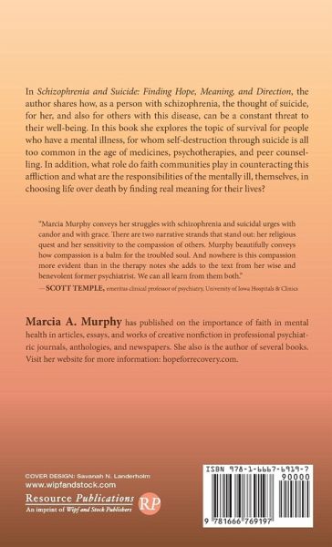 In Schizophrenia and Suicide: Finding Hope, Meaning, and Direction, the author shares how, as a person with schizophrenia, the thought of suicide, for her, and also for others with this disease, can be a constant threat to their well-being. In this book she explores the topic of survival for people who have a mental illness, for whom self-destruction through suicide is all too common in the age of medicines, psychotherapies, and peer counselling. In addition, what role do faith communities play in counteracting this affliction and what are the responsibilities of the mentally ill, themselves, in choosing life over death by finding real meaning for their lives?